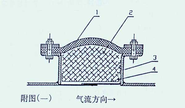 非金屬補償器是由:(1)非金屬復合圈帶 (2)隔熱填料層 (3)機架 (4)不銹鋼絲網等組成。見附圖。